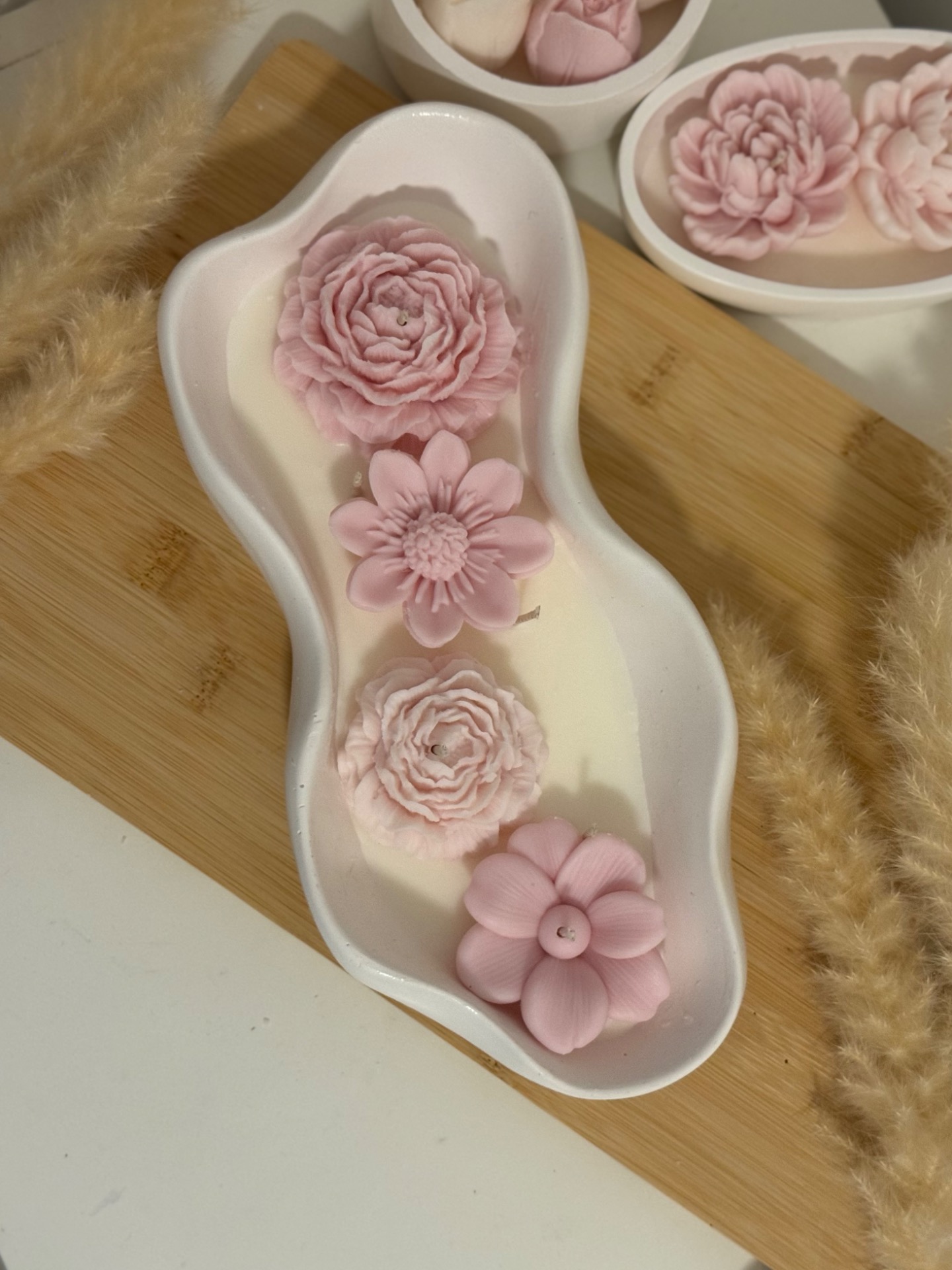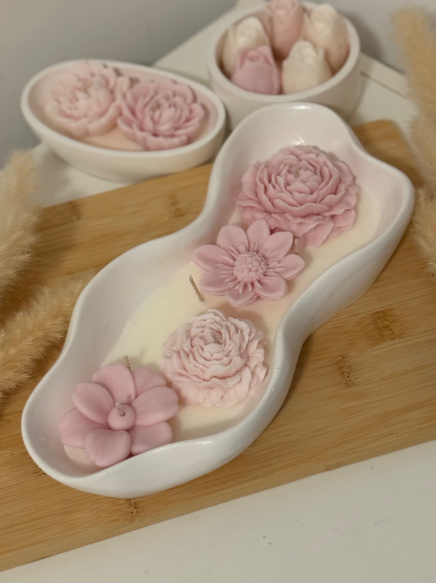 A Blush Garden Tray illatgyertya egy igazi statement darab. Hosszúkás, hullámzó formájú fehér kerámiatálban készült, tetején pasztell rózsaszín virágokkal – bazsarózsákkal és finom szirmú virágokkal –, amelyek egy virágos kert nyugalmát és lágyságát idézik.