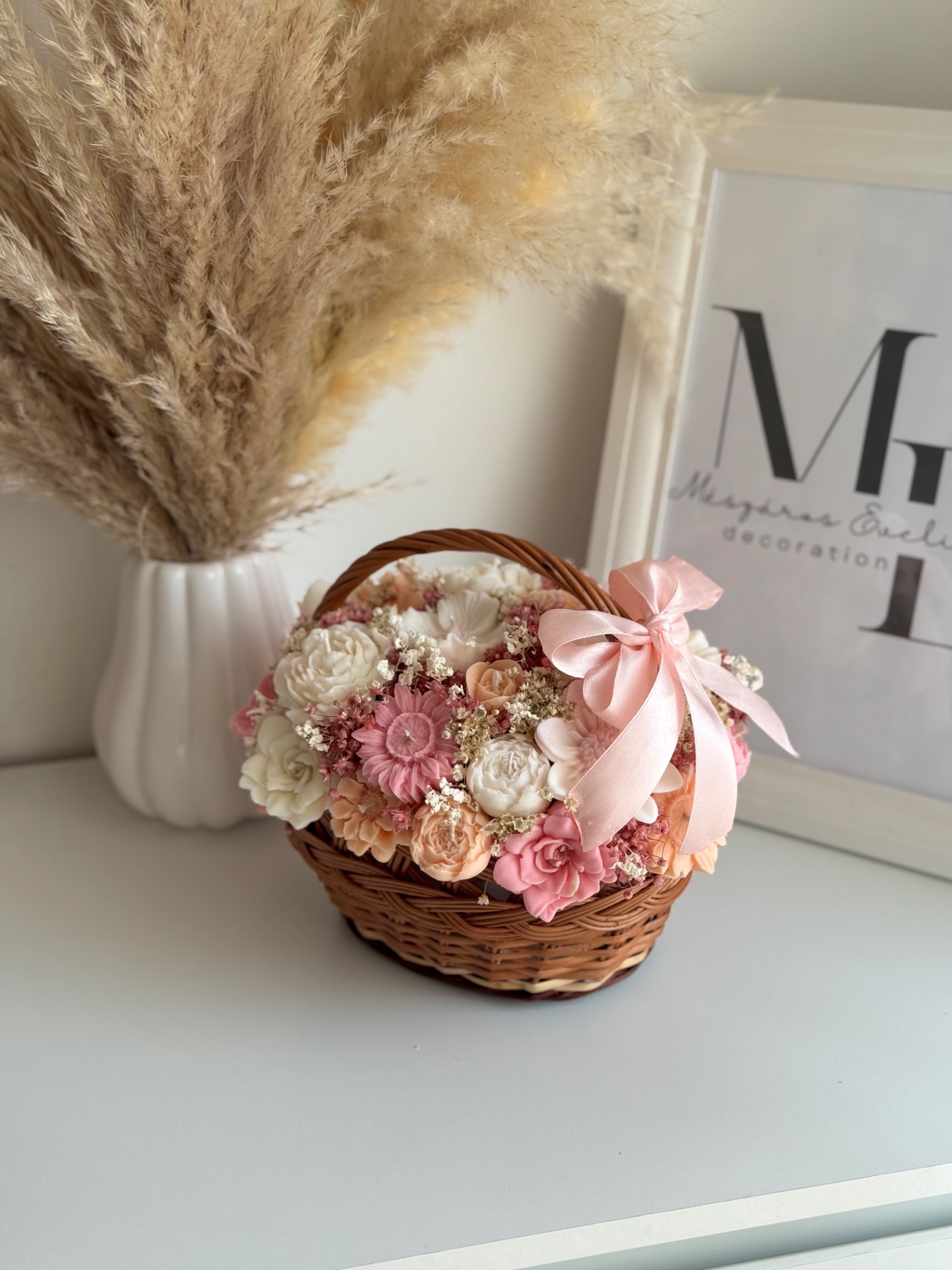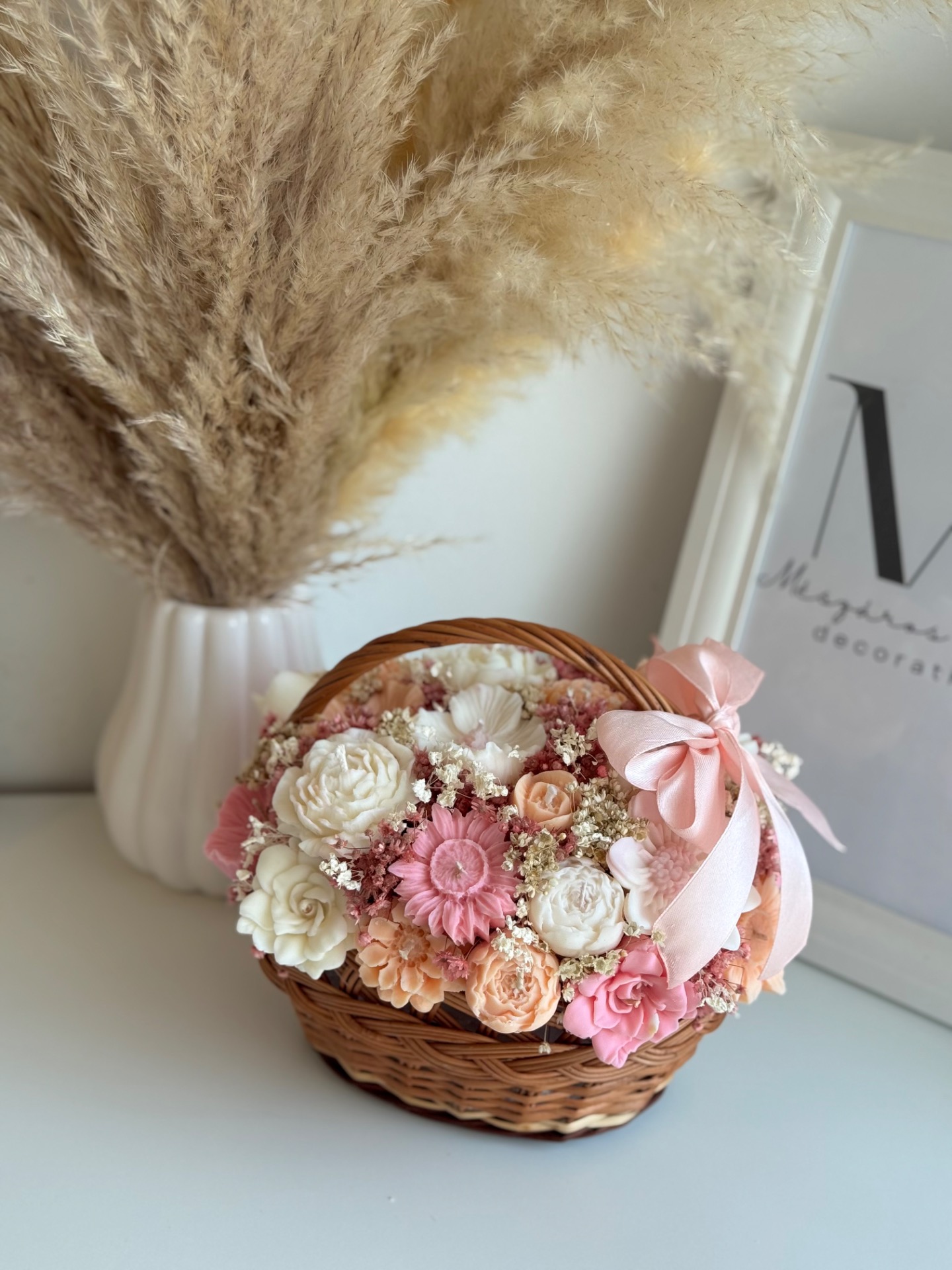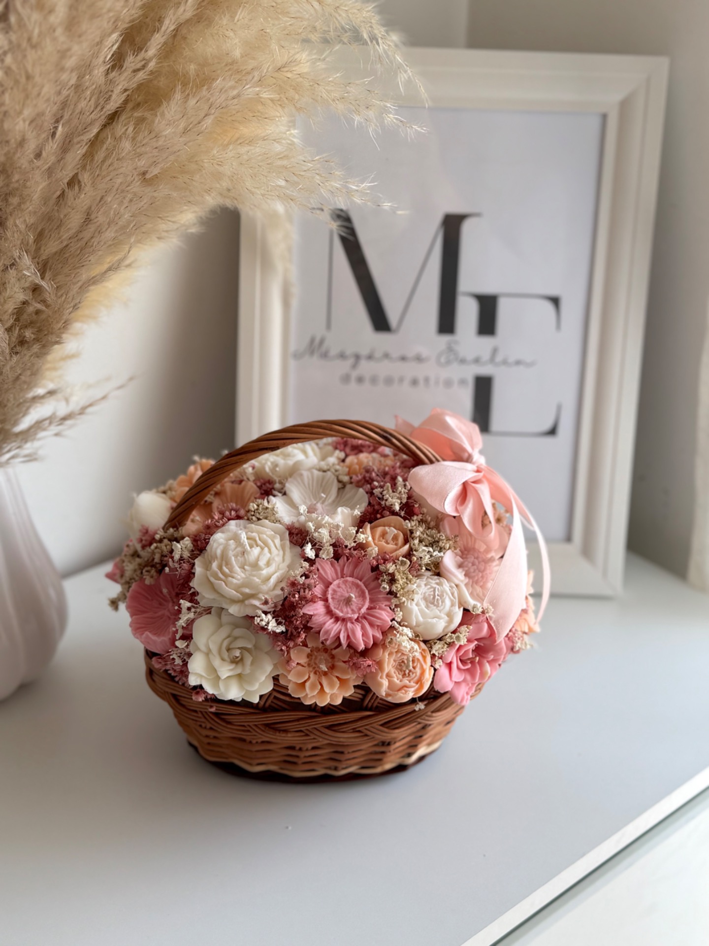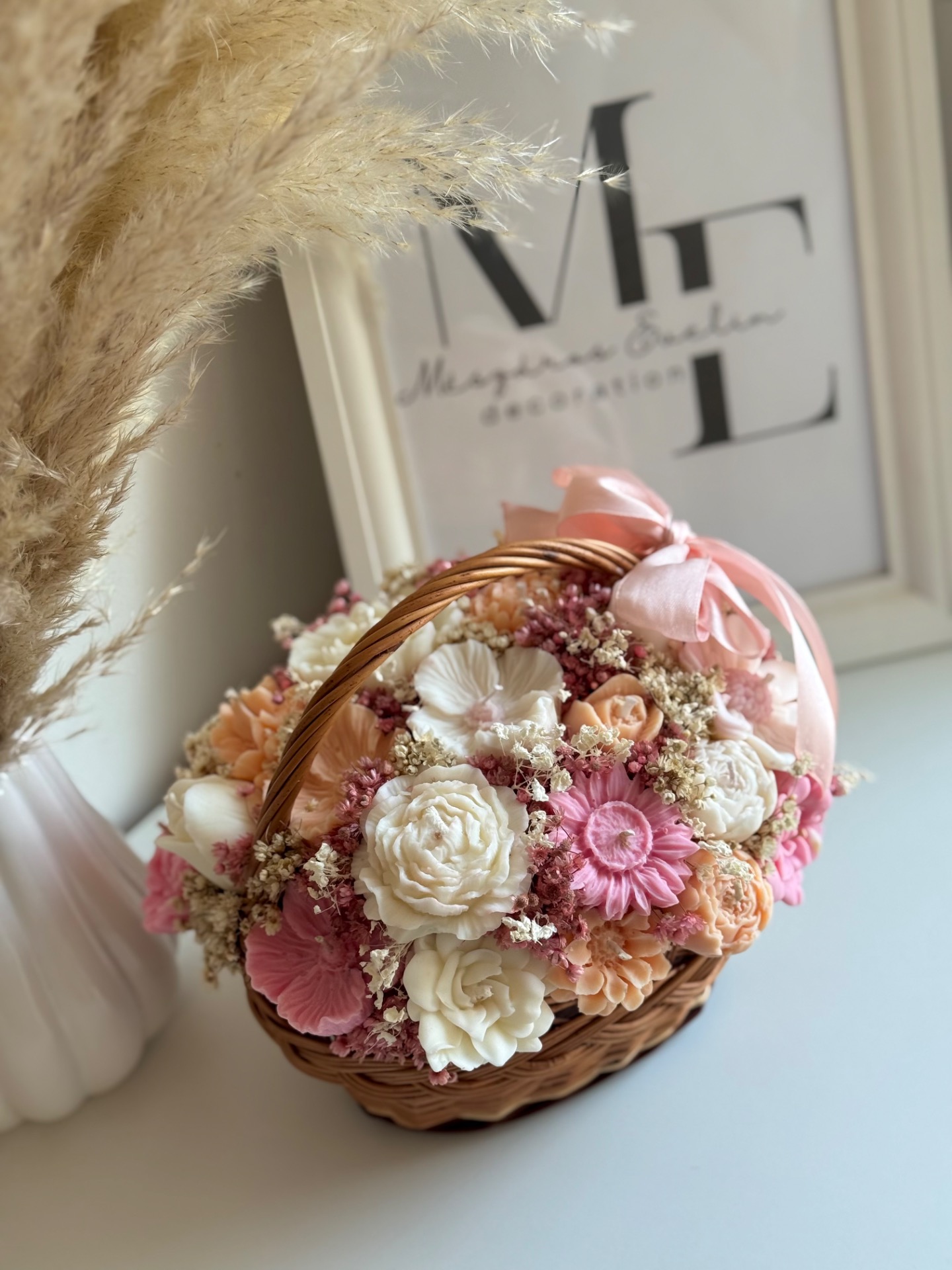 A japán cseresznyevirág illat finoman lengi körbe a teret, miközben a szárazvirág díszítés és a fonott kosár természetes, elegáns alapot ad az egész kompozíciónak.