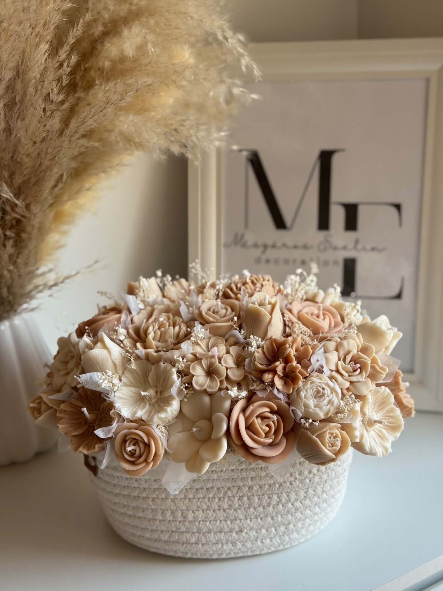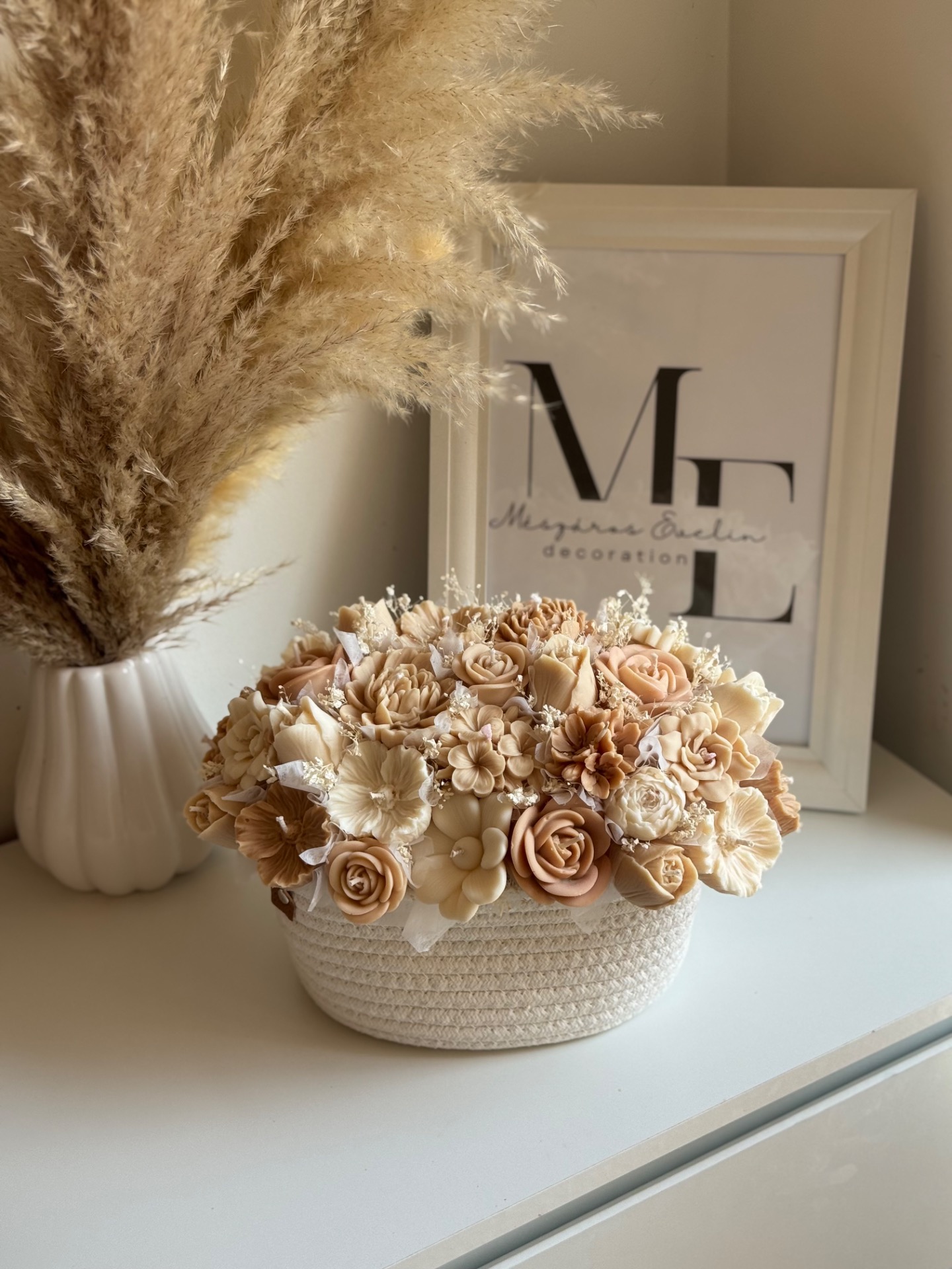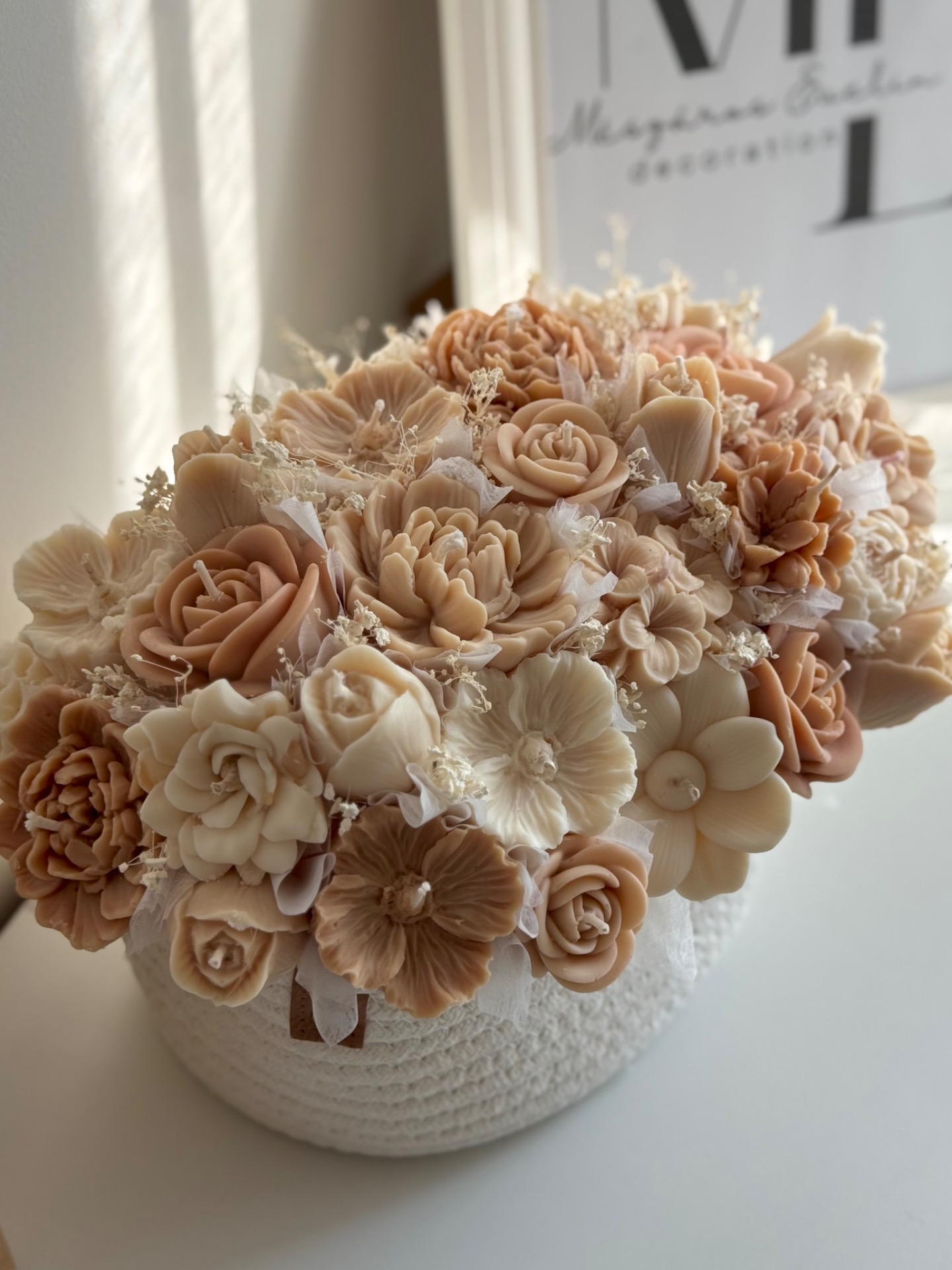 A Candle Flower Basket egy különleges, kézzel készített gyertyavirág kompozíció, amely nemcsak dekorációként, hanem élményként is jelen van az otthonodban.