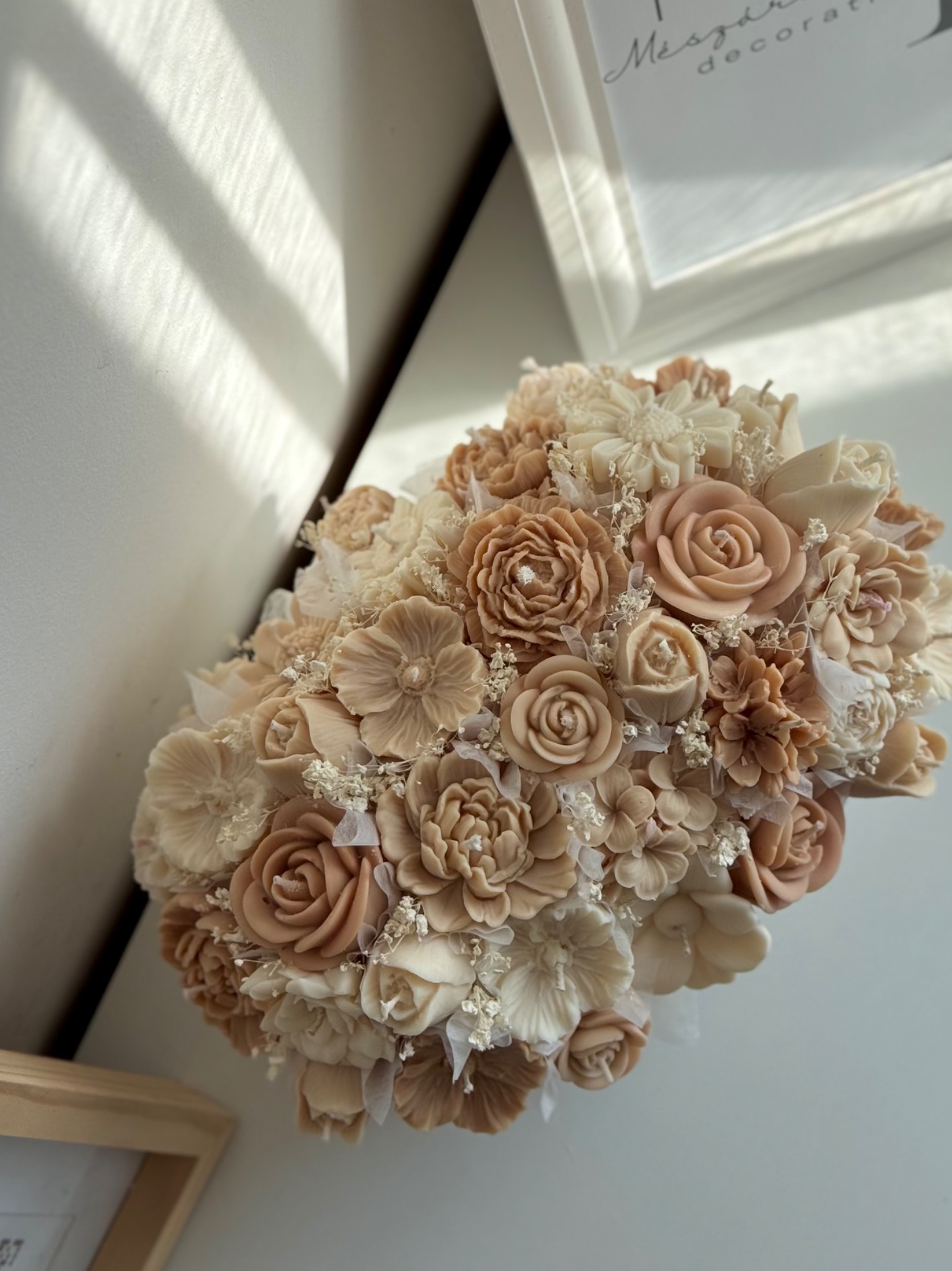 A kompozíció 34 darab gyertyavirágból áll, és több mint 1 kg szójaviaszból készült – ez adja a súlyát, a tartósságát és a prémium érzetét.