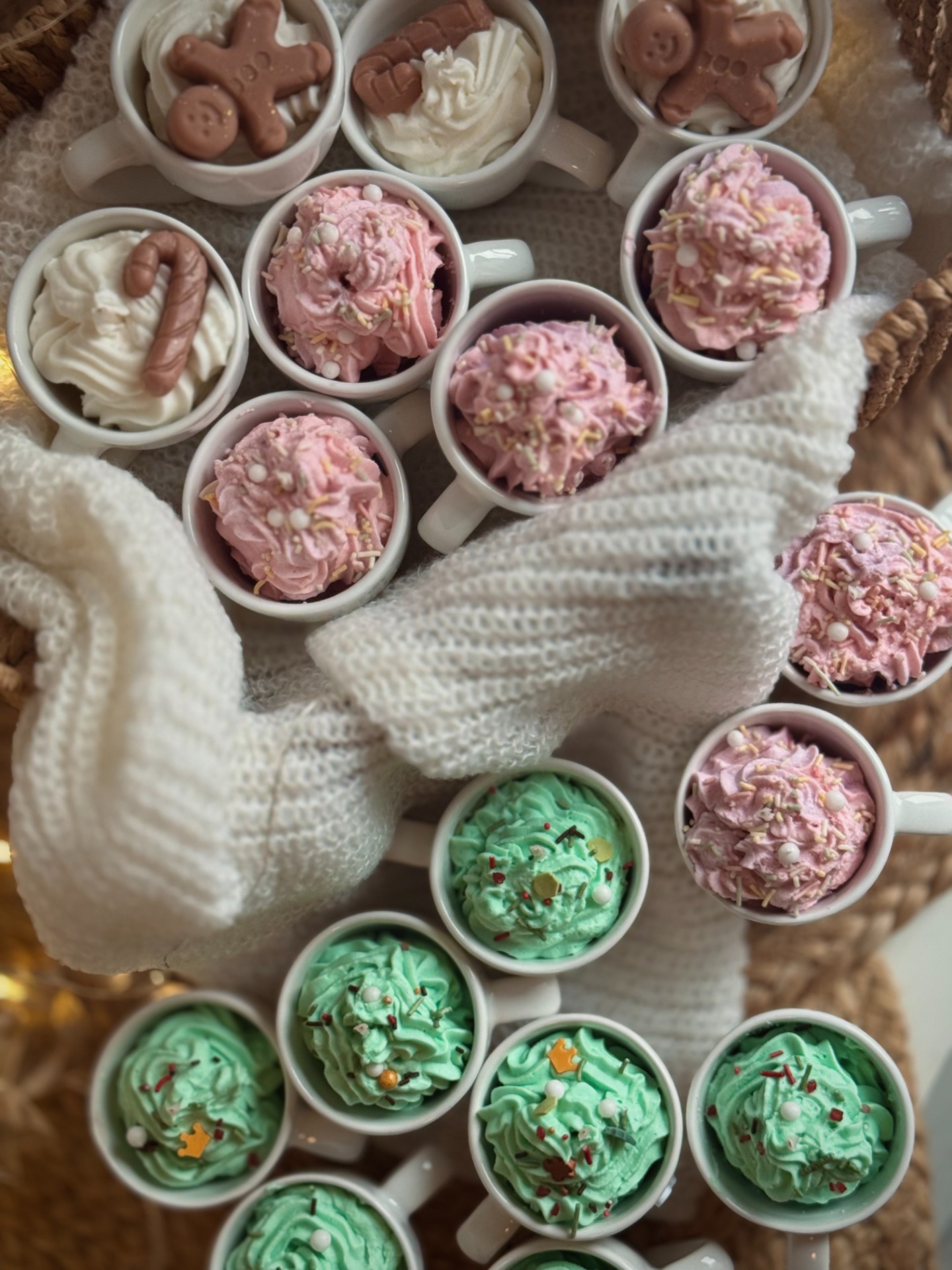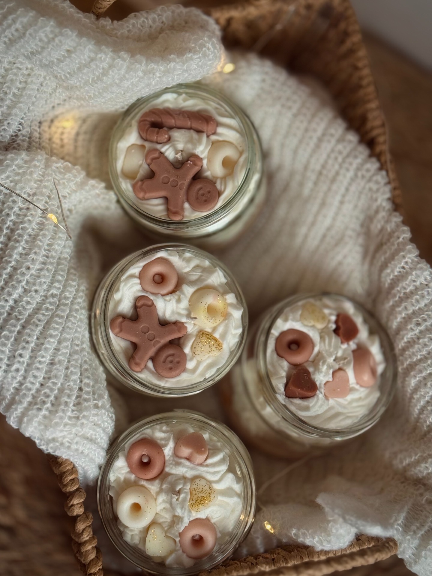 Édesen fűszeres illata – a mézeskalács, barna cukor, fahéj és vanília tökéletes harmóniája – pillanatok alatt otthonossá varázolja a teret. A lágy habos díszítés és a kézzel készített apró "mézeskalács" figurák még különlegesebbé teszik, minden darab egyedi, ahogy a ME decoration minden terméke.