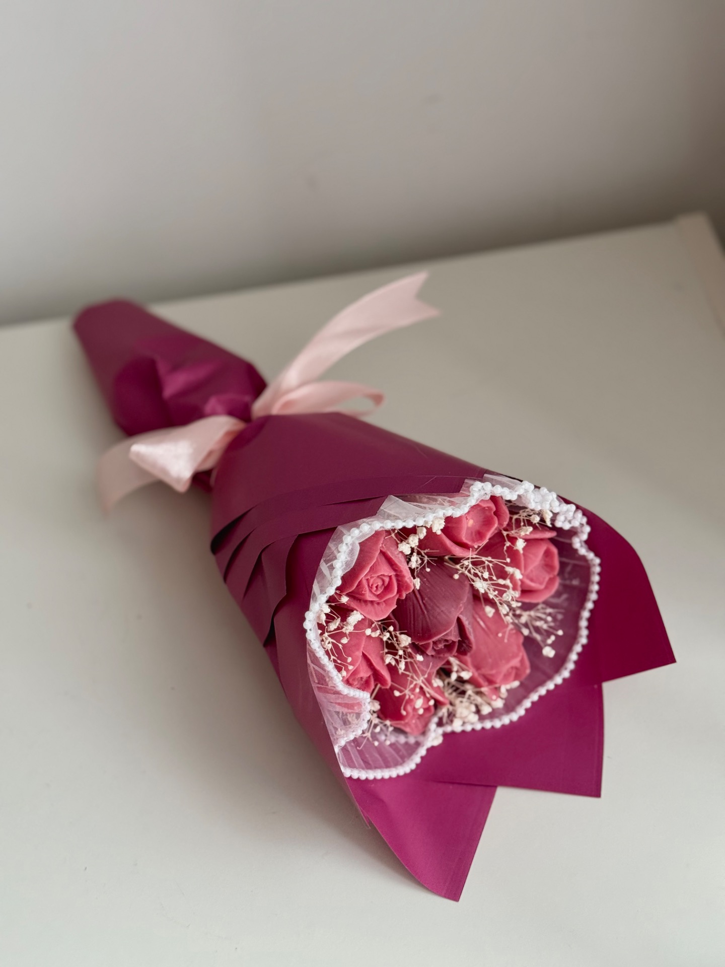 Kézzel készült gyertyacsokor szójaviaszból, gondosan formázott viaszvirágokból. Kanóc nélküli darab, elsősorban dekorációs célra készült, de viaszmelegítőben illatviaszként is használható.