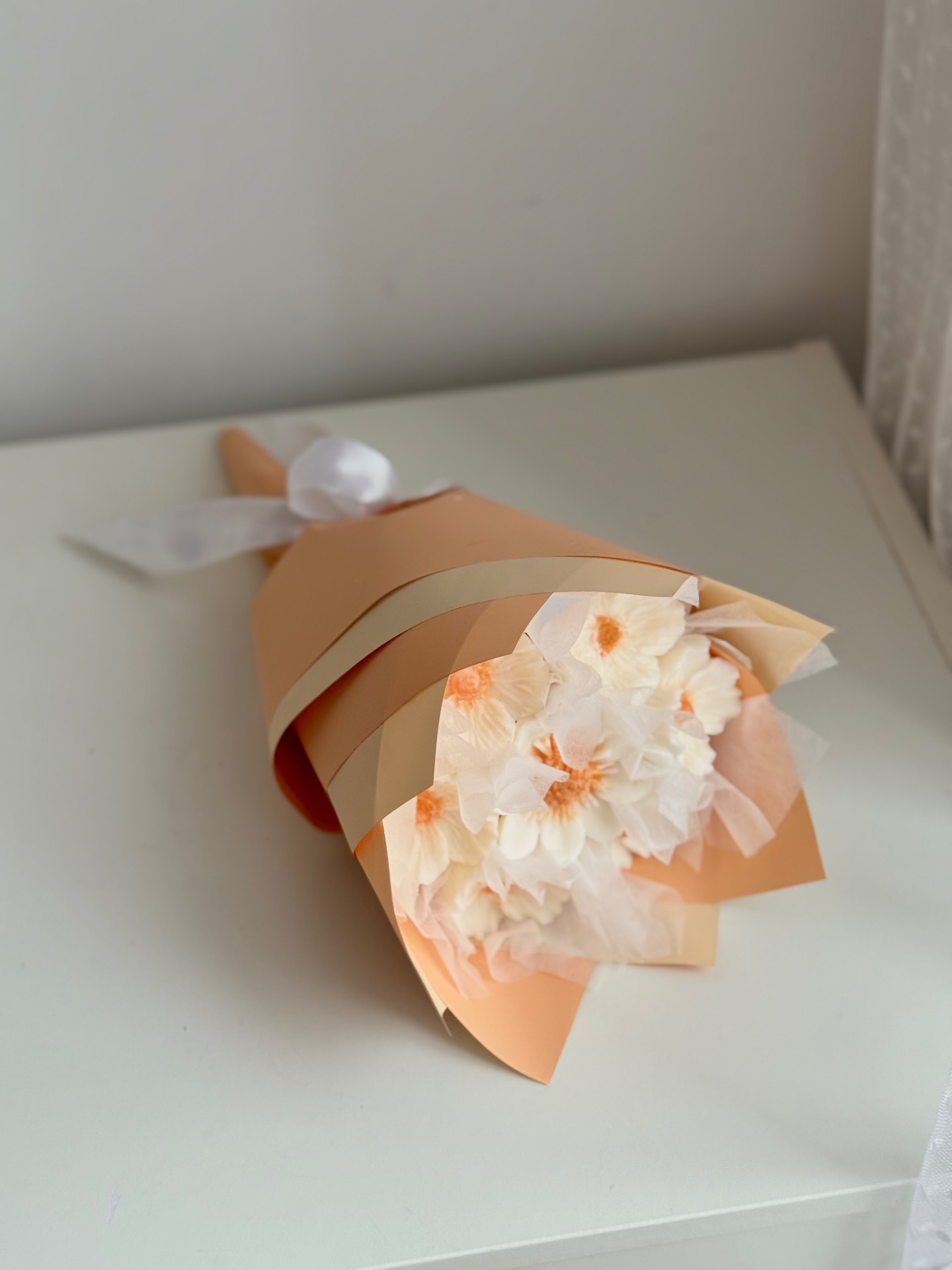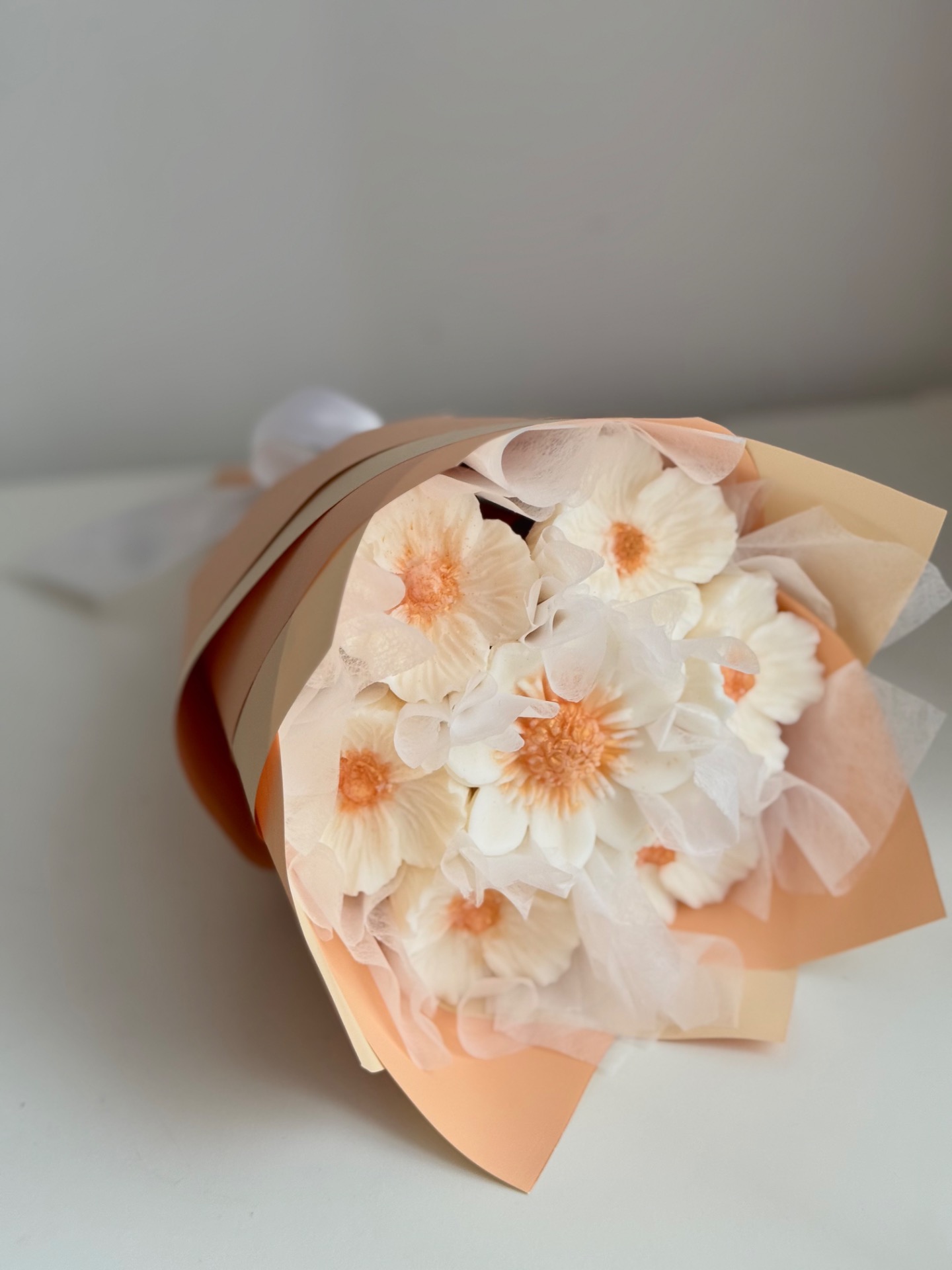 Kézzel készült gyertyacsokor szójaviaszból, gondosan formázott viaszvirágokból. Kanóc nélküli darab, elsősorban dekorációs célra készült. Letisztult, finom megjelenésű csokor, amely önmagában is hangulatot teremt.
