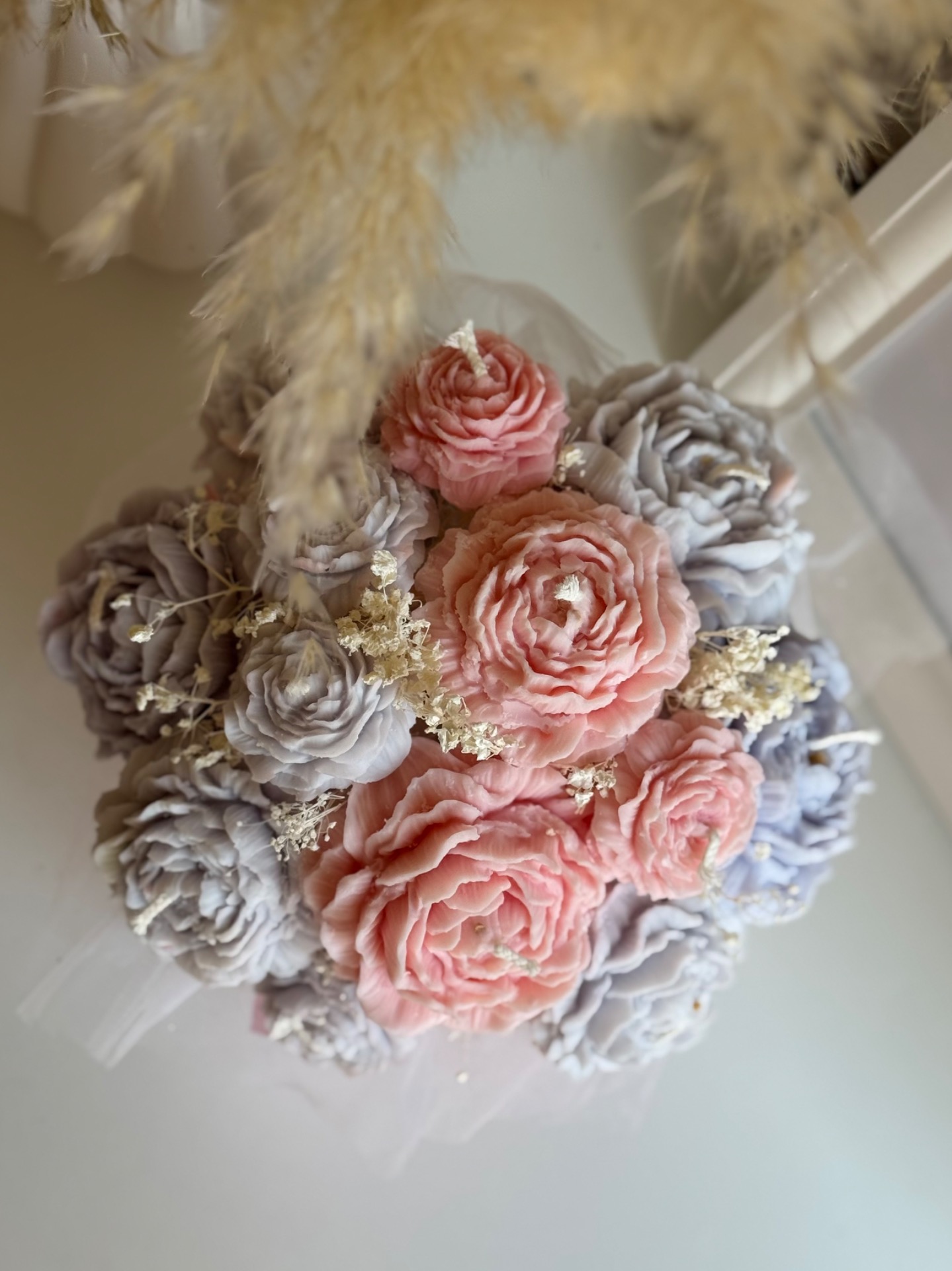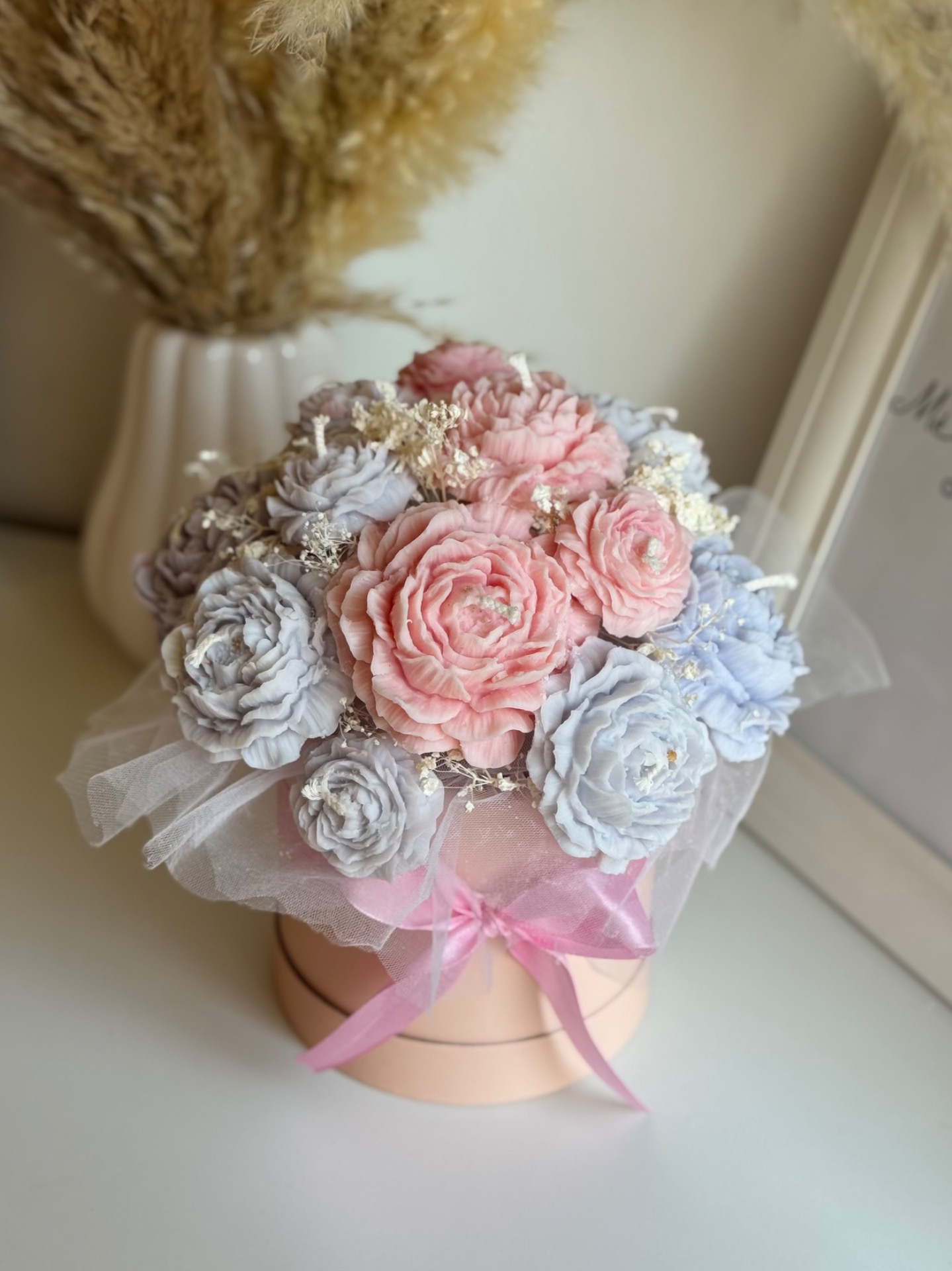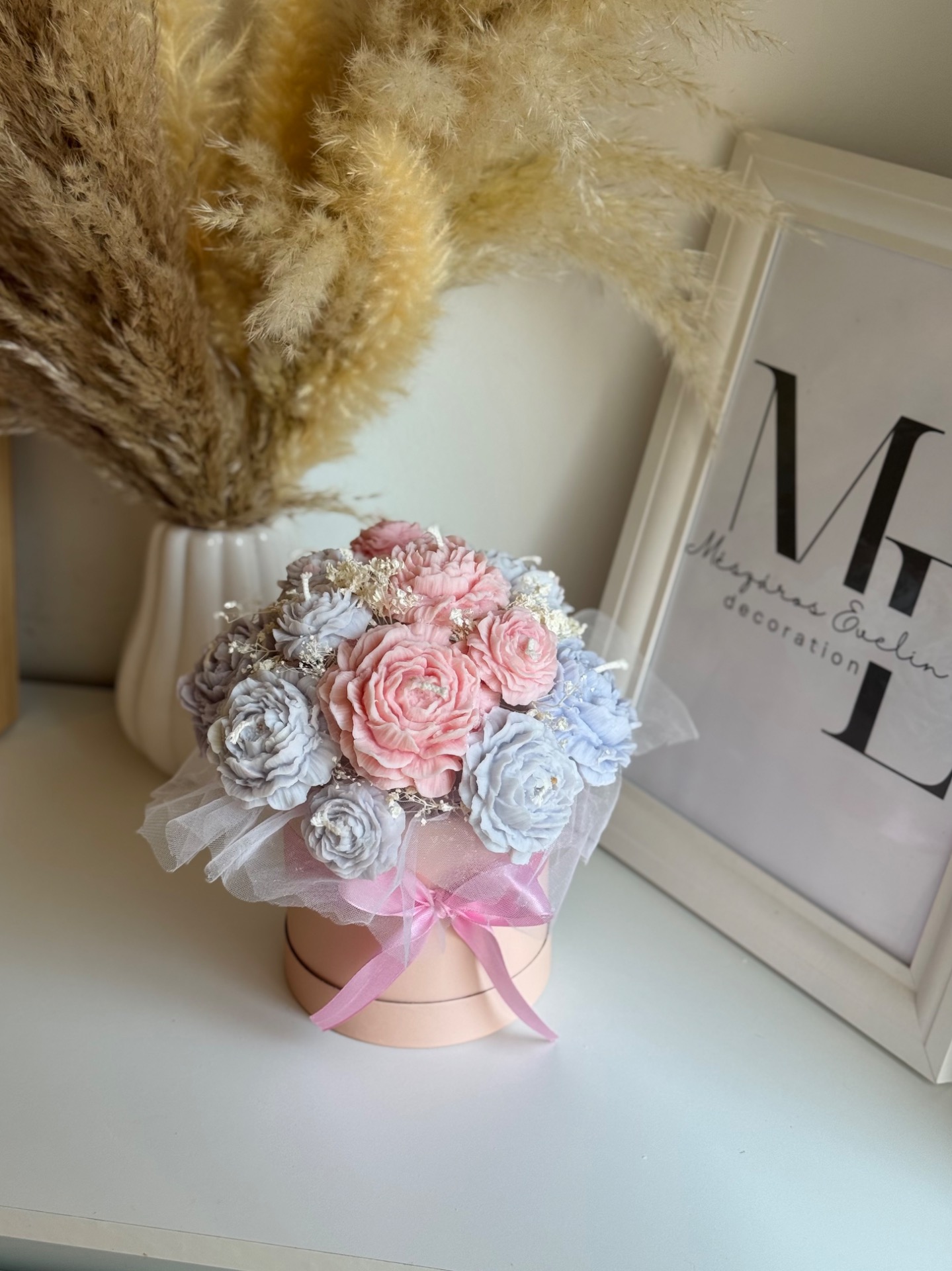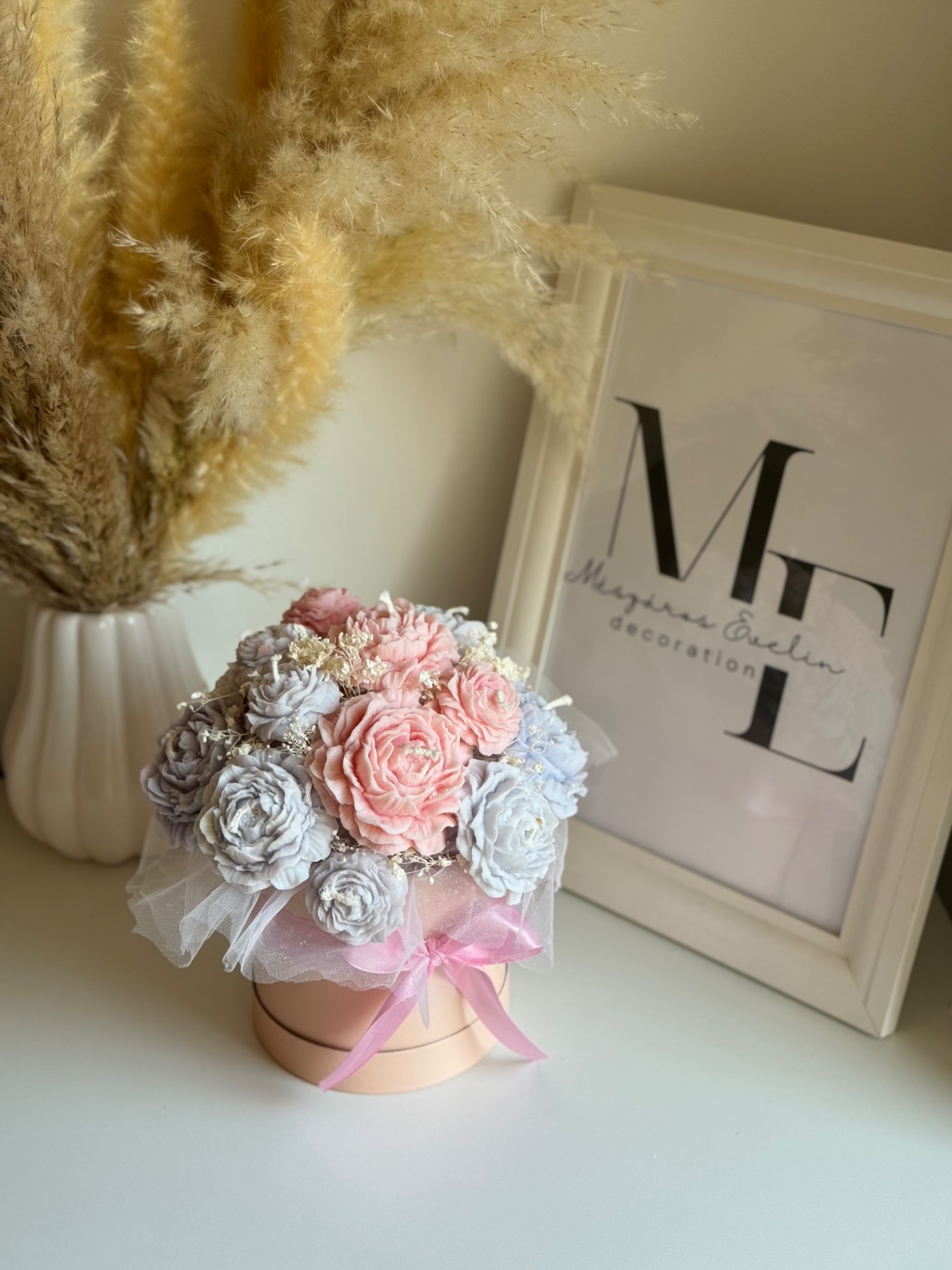 A Peony Bouquet Box egy finoman kidolgozott, kézzel készített gyertyacsokor, amely lágy pasztell színeivel és harmonikus formáival elegáns, mégis szerethető hangulatot teremt.