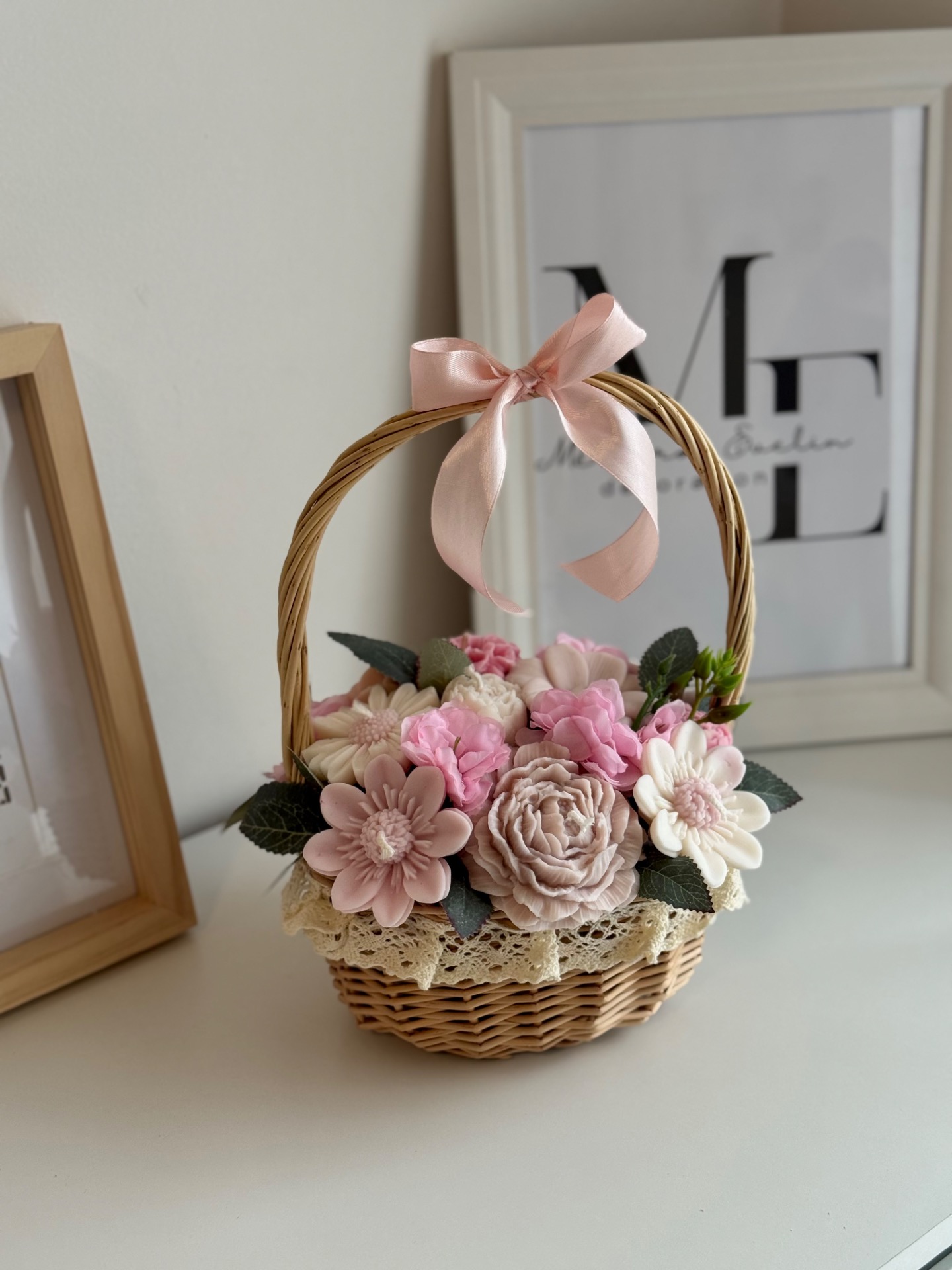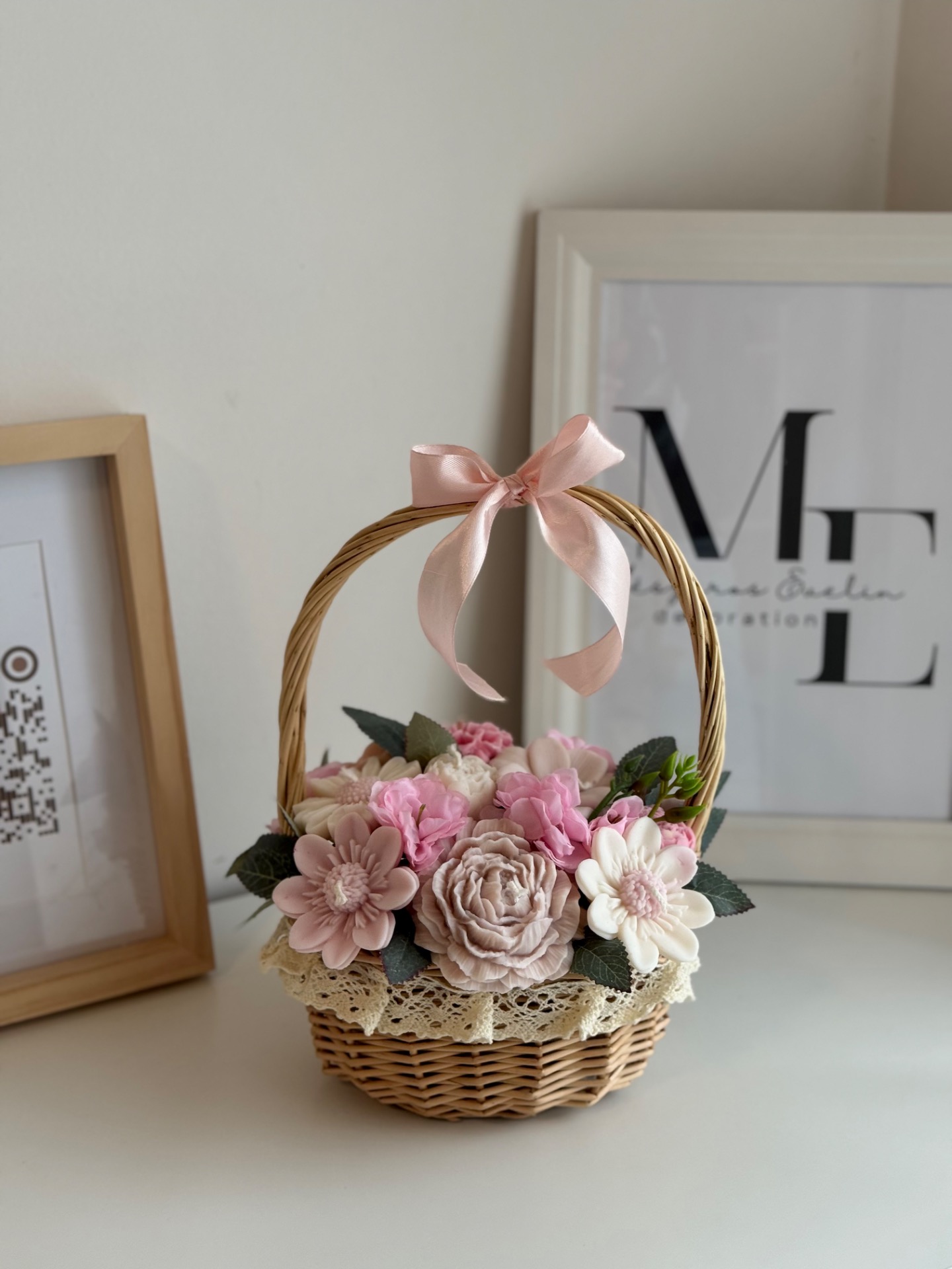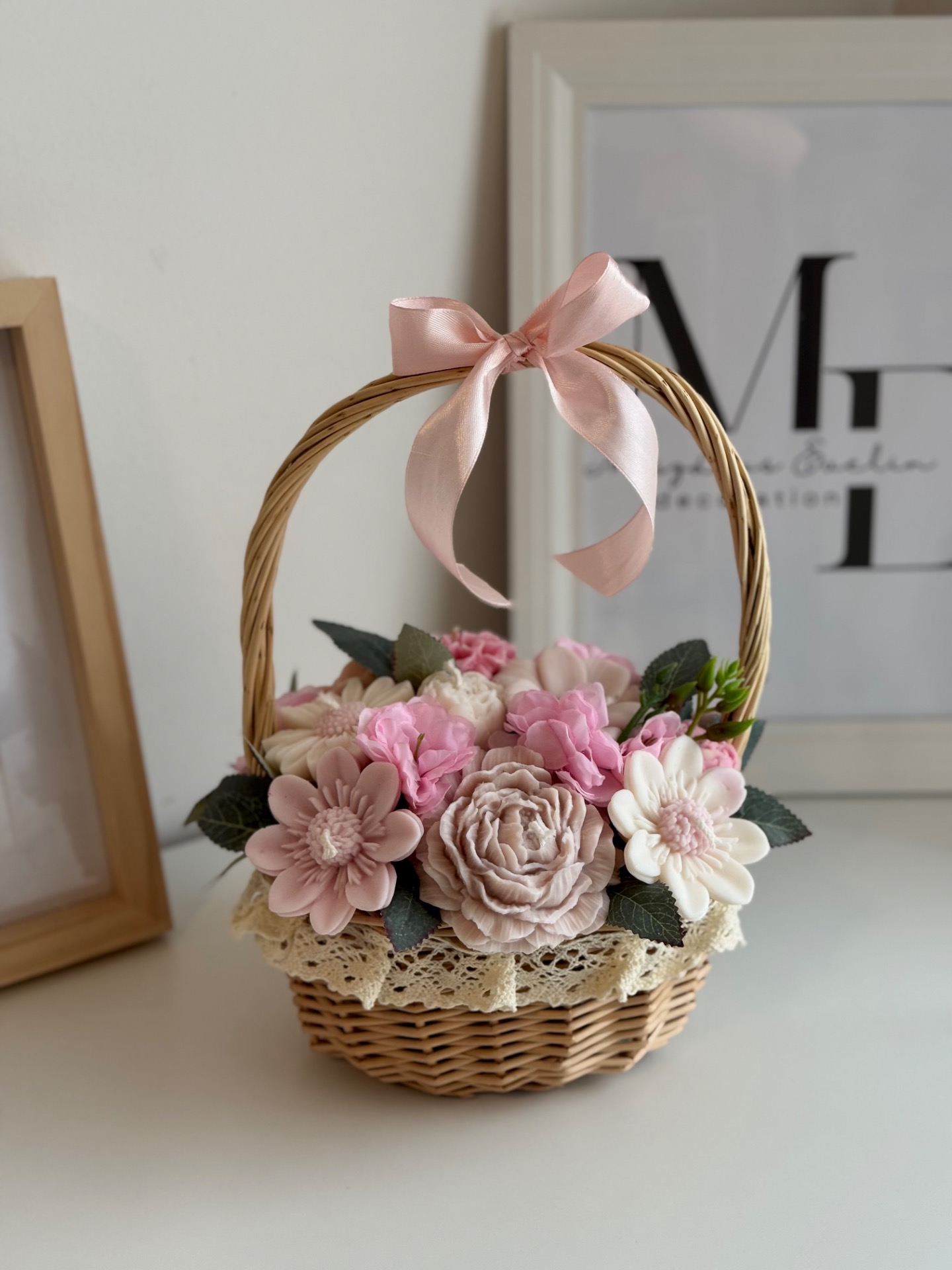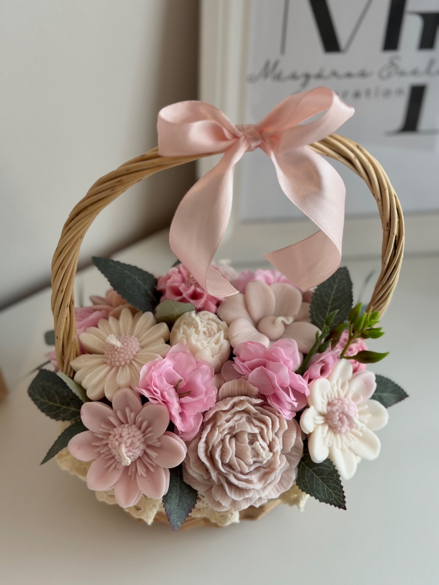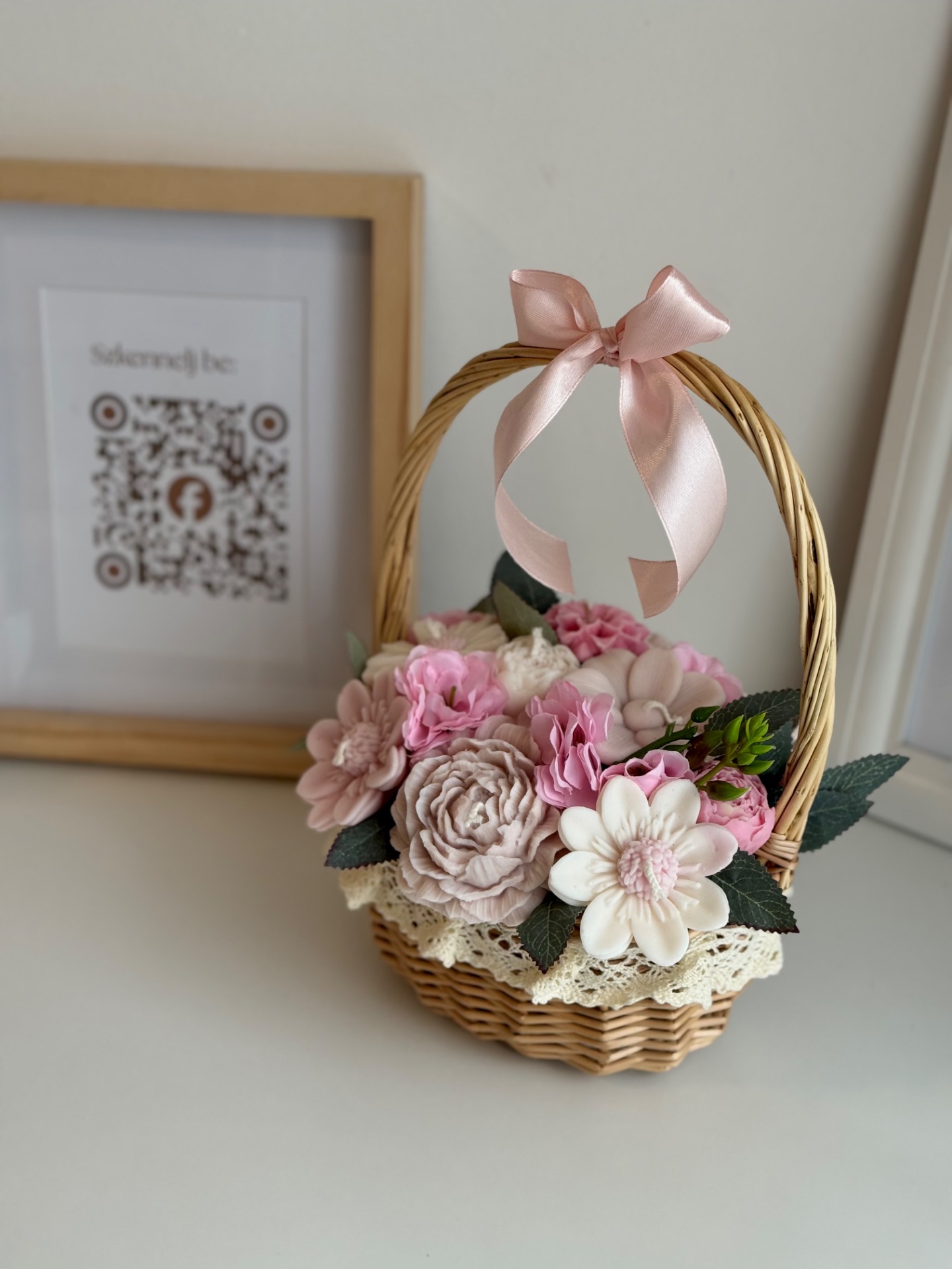 A kompozíció 13 darab kézzel készített gyertyavirágból áll, természetes hatású fonott kosárban elrendezve, elegáns masnival díszítve. A virágok prémium minőségű szójaviaszból készülnek, pamut kanóccal, így egyenként meggyújthatók.