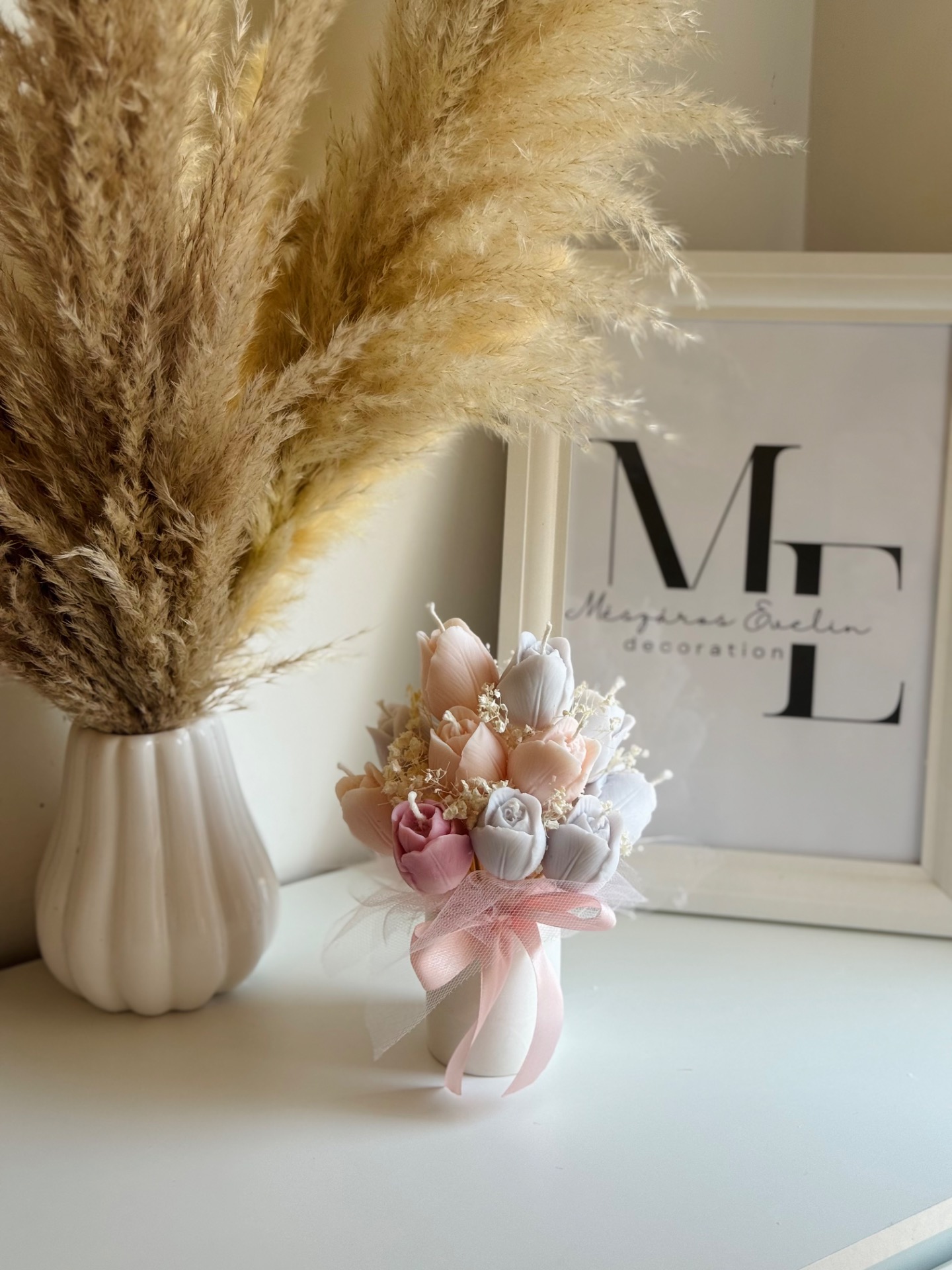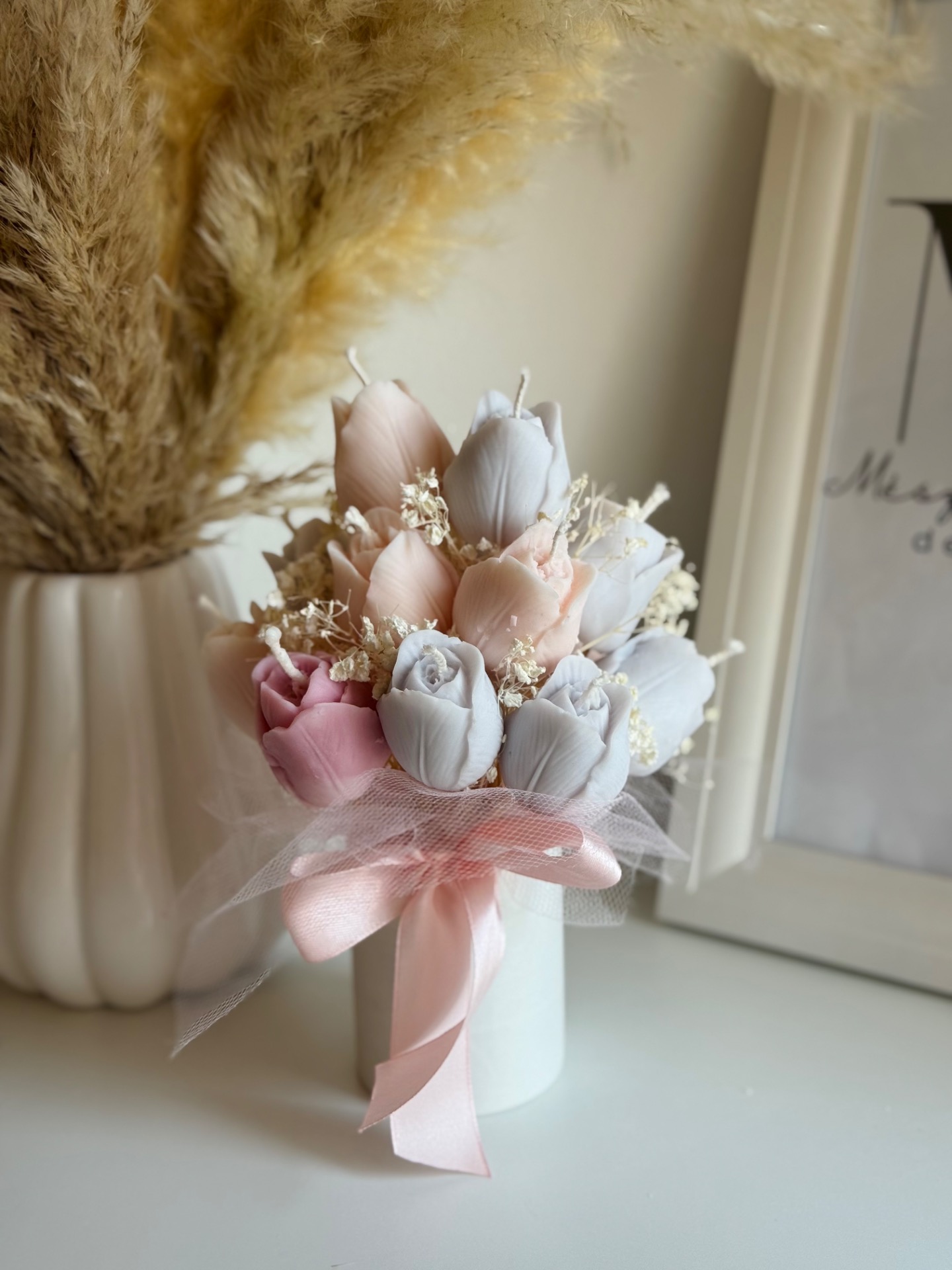 A 14 szál tulipán gyertya egyenként formázott, így a csokor minden részlete gondosan megalkotott. A szárazvirág díszítés és a masnival átkötött papírdoboz együtt egy könnyed, mégis elegáns összhatást ad.