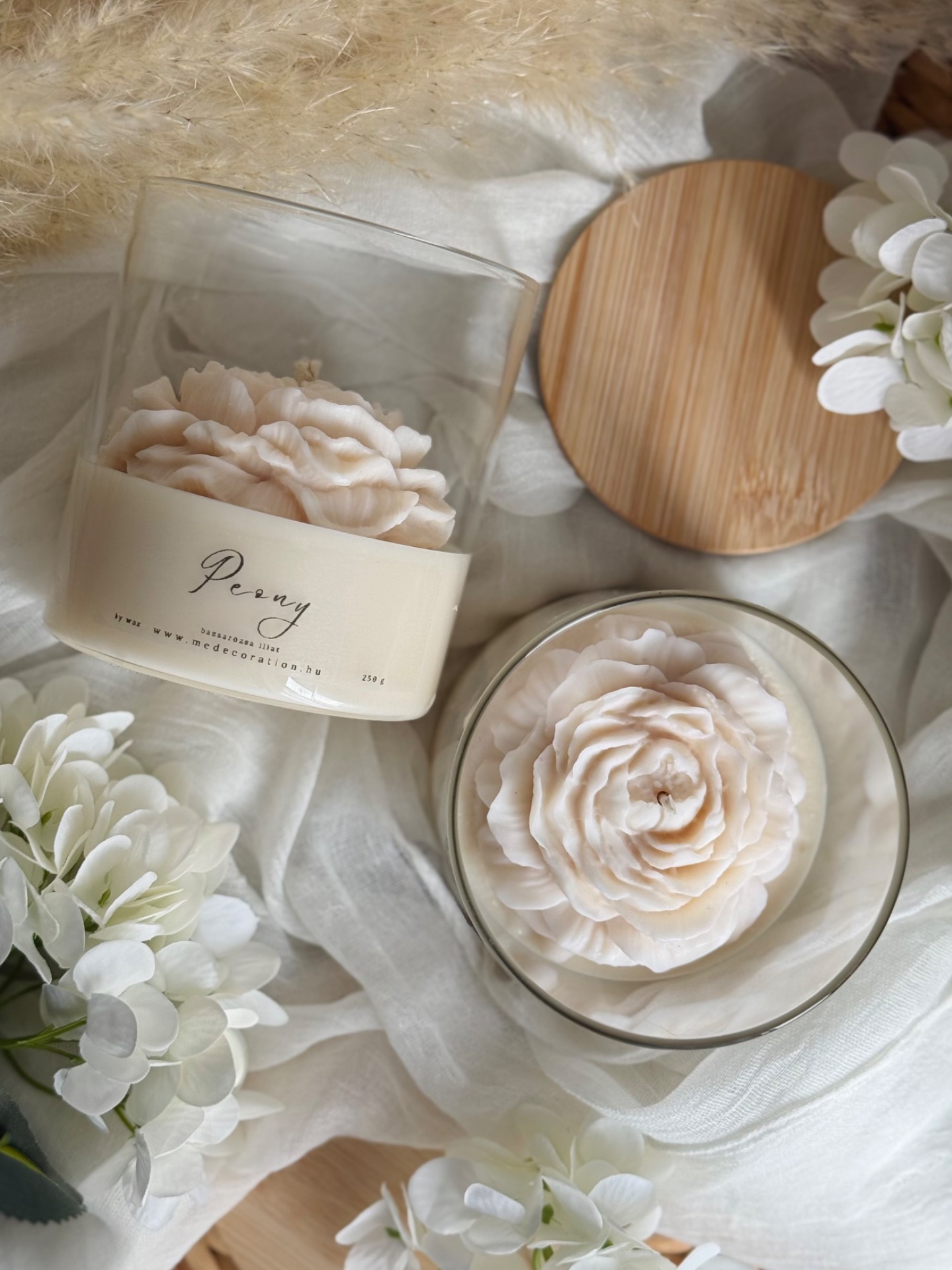 Peony illatgyertya – bazsarózsa illat, szójaviasz, bambusz tetős üvegben (250 g)